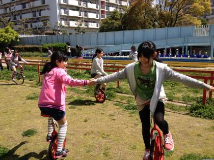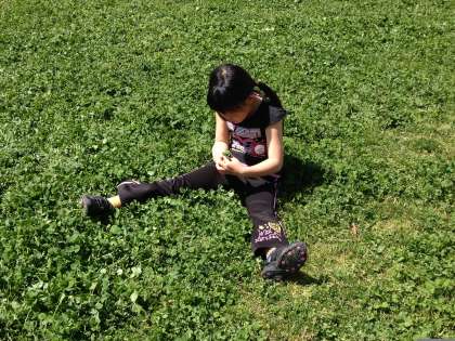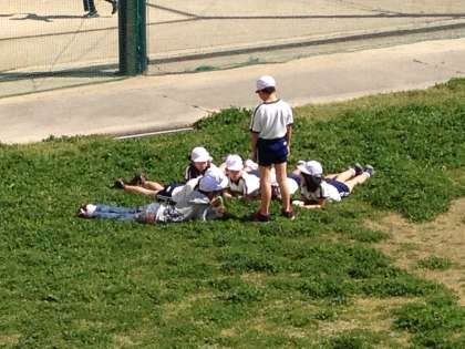 創立30周年を記念して、当時の子どもたちが植えた芝生。今では、すっかり子どもたちの憩いの広場になっています。ここは、外で寝っころがる環境をつくりたいという思いから生まれました。1年を通して、様々な小鳥や虫たちの楽園にもなっています。