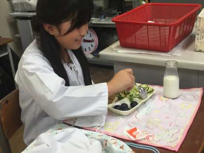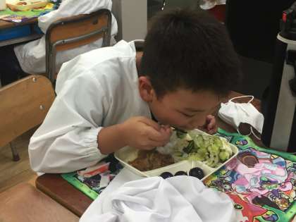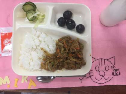 今日の給食は、ドライカレー、グリーンサラダ、巨峰でした。カレーもサラダもモリモリ食べる元気な3年生です。