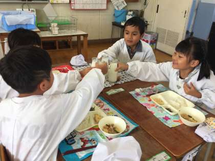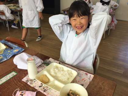 今日の給食は、豚肉と一口がんもの煮物、さつまいもの天ぷら、ミニフィッシュでした。涼しくなってきたこともあり、よく食べるようになってきました。まさに食欲の秋です。