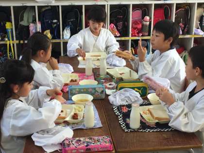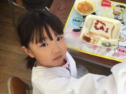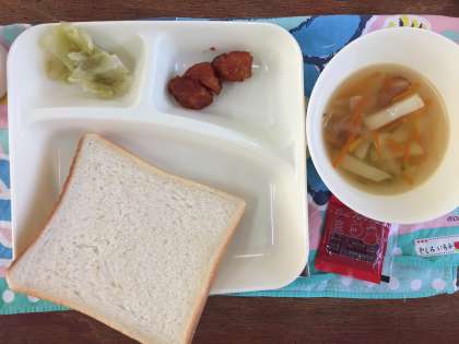 今日の給食は、まぐろのオーロラ煮、じゃがいものスープ、サワーキャベツでした。ずいぶんと以前からあるオーロラ煮ですが、子どもたちには人気メニューです。