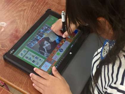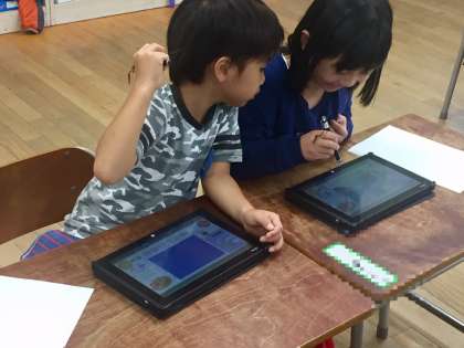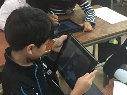 1年生は自由にタブレット端末を使います。絵をかいたり、写真を撮ったりできます。さらに、それを加工することもできます。