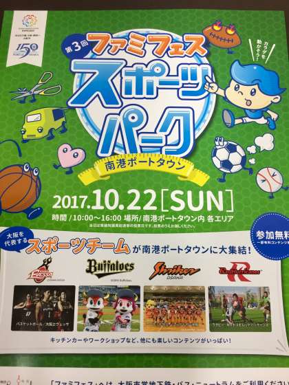 南港ファミフェスも3回目となります。今回はスポーツパークということで、大阪を代表するスポーツチームが南港にやってきます。昨日、本校に来てくれた大阪エヴェッサ、オリックス・バファローズ、大阪シュライカー、NTTドコモ・レッドハリケーンズです。