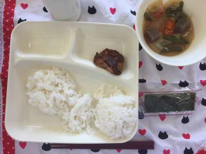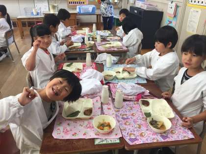今日の給食は、みそカツ、じゃがいもと野菜の煮物、焼きのりでした。大阪の子どもたちですから、焼きのりはなじみがなく、味がついてないという感想でした。みそカツは、八丁味噌を喜んで食べていました。