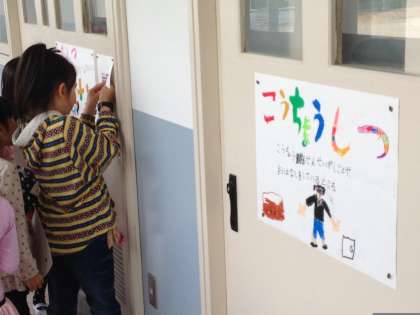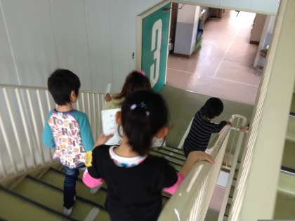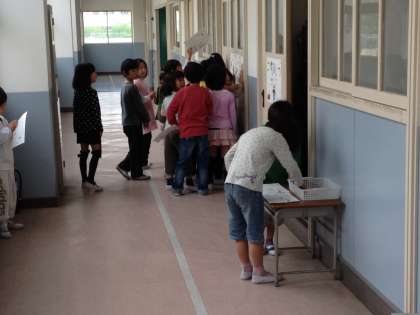 今日は1・2年生が「学校たんけん」をしました。2年生がリード役になって、学校のいろいろな場所に案内していました。めあての場所にくると、スタンプやシールをカードにはっていきます。みんな、とっても楽しそうに活動していました。