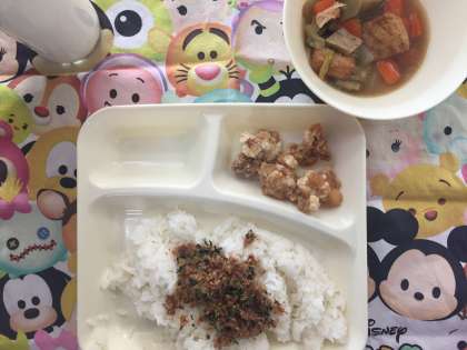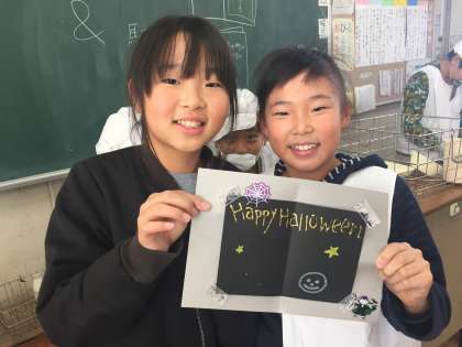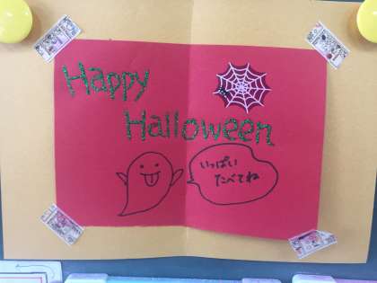 今日の給食は、あつあげと野菜の煮物、鶏肉のたつたあげ、おかかなっ葉でした。そして給食調理員さんから各教室に、ハロウィーンのカードが届きました。