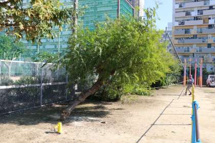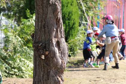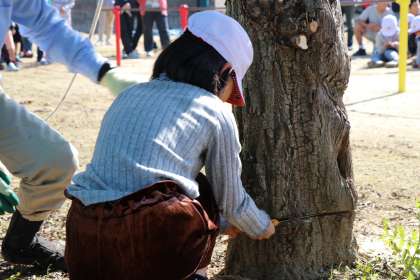 木を伐り、倒す作業も体験しました。パキッとした音をともに倒れる様子は迫力がありました。子どもたちから思わず拍手がおこっていました。