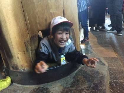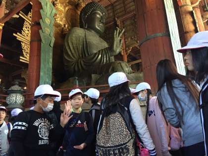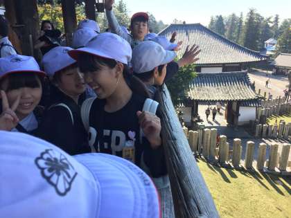 東大寺では大仏と対面しました。はじめて見るという子は、その大きさに圧倒されていました。また、大仏殿の柱の穴くぐりにも何人かが挑戦しました。お水取りで有名な二月堂にもまわり、舞台まで登りました。