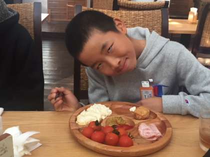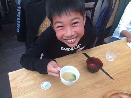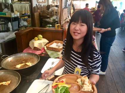 お昼を食べています。新鮮な野菜やハム、ソーセージをはじめ、美味しい料理が並んでいます。みんな大喜びです。