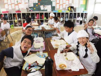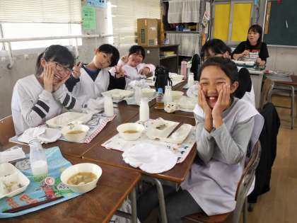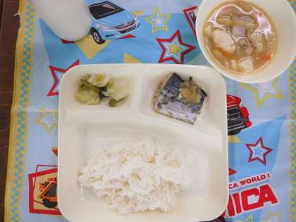 今日の給食は、さごしのおろしじょうゆかけ、けんちん汁、こまつなとはくさいの甘酢あえでした。4年生の教室は、とってもあったかくて、幸せな味がしました。