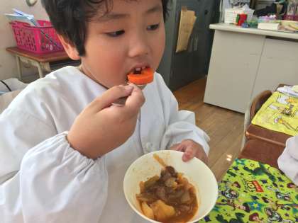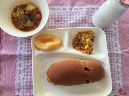 今日の給食は牛肉のケチャップ煮、かわりピザ、白桃でした。寒さを感じるようになってきましたから、ケチャップ煮のあったかさがうれしかったです。