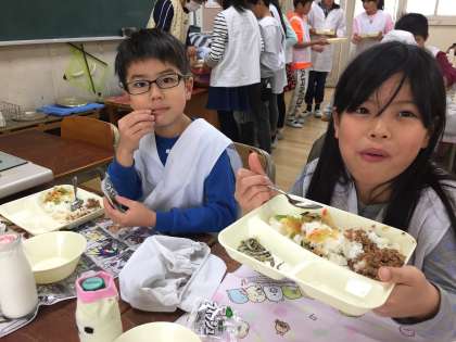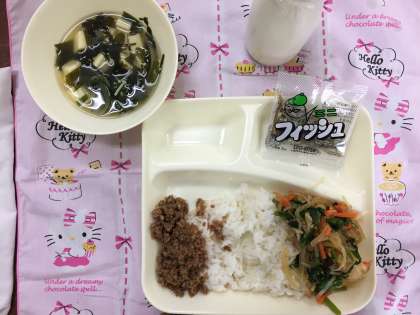 今日の給食は、ビビンバ、わかめスープ、ミニフィッシュでした。ビビンバは、とても人気で、あっという間に食缶が空っぽになりました。