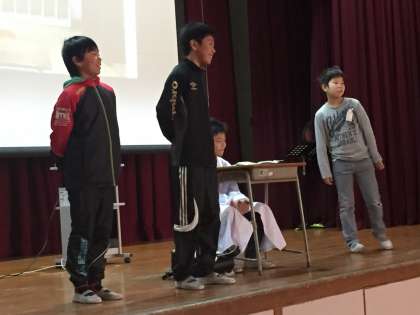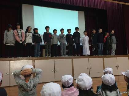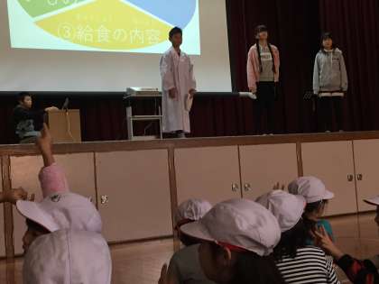 今日の集会は、給食委員会の発表でした。劇の中に映像や資料を効果的につかって、とてもわかりやすく給食のことを教えてくれました。すばらしい発表でした。