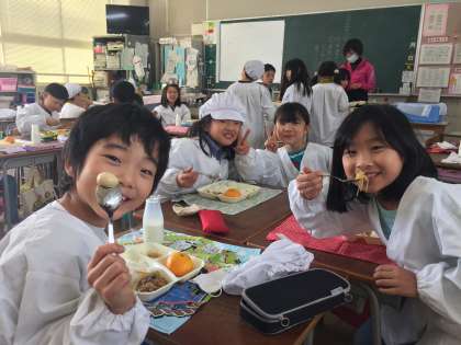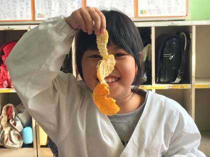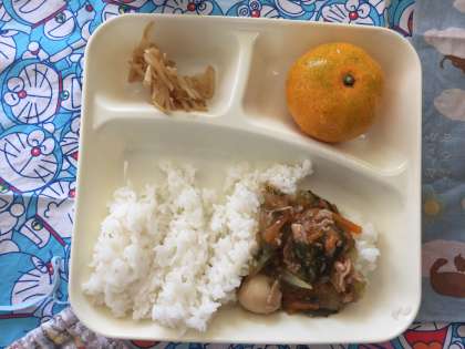 今日の給食は、中華丼、もやしの中華あえ、みかんでした。みかんがおいしい季節になりました。