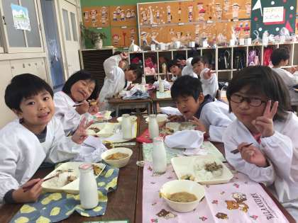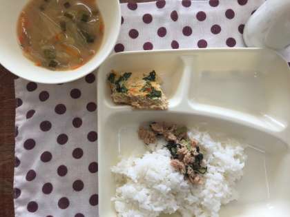 今日の給食は、千草焼き、ツナっ葉いため、みそ汁でした。千草焼きはおいしかったみたいです。ツナっ葉もごはんにまぜて、よろこんで食べていました。