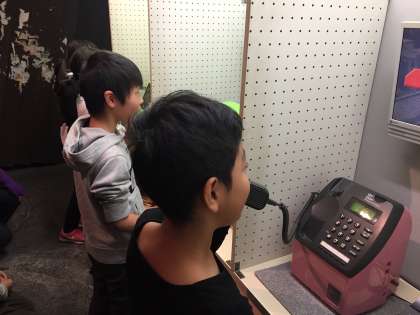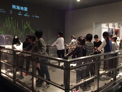 救急電話をかけたり、震災後の町を歩いたりしました。震災後の町は、とてもリアルにつくってあるので子どもたちは地震のおそろしさを感じていました。そして、阪神淡路大地震や南海地震(想定)の揺れを体験しました。