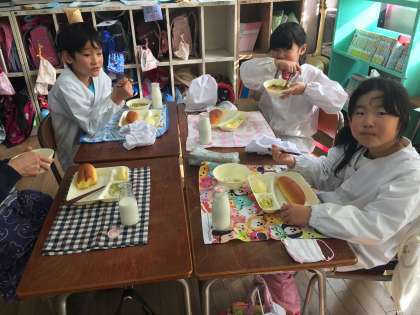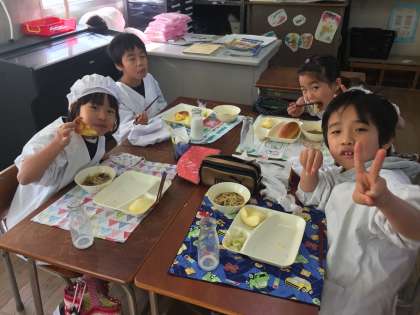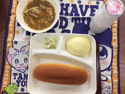 今日の給食はカレーうどん、はくさいの甘酢あえ、りんごでした。パンにカレーをつけて食べている子がたくさんいました。やはり、子どもたちはカレーが大好きです。