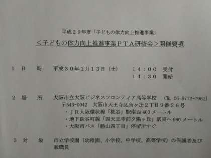 「スポーツをする子どもの食事について〜食事から考える体つくり〜」というテーマで、1月13日(土)14時30分から、大阪ビジネスフロンティア高等学校で行われます。体力向上に食事はとても大切で、大変興味深い研修会です。