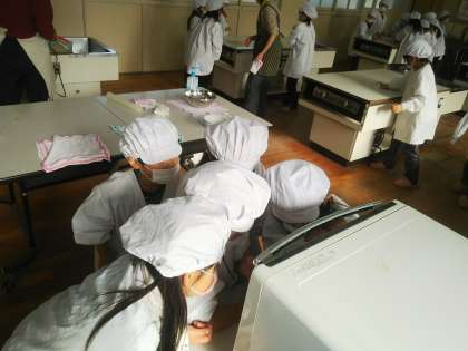 オーブンに入れて、焼くこと10分程。待ちきれない子どもたちは覗き込んでカウントダウン!家庭科室がだんだんと甘い香りで包まれます。