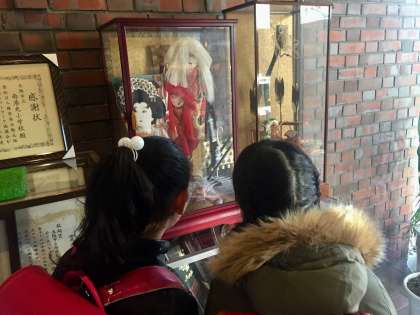 学校の玄関は、一足はやくお正月の飾りつけです。破魔矢に羽子板は、かつてはよく見かけたお正月飾りでした。オルゴールからは「一月一日」のメロディが流れています。