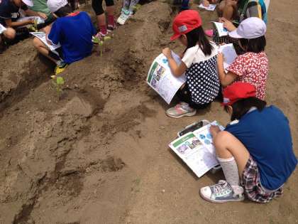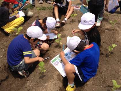 どの学年も、そろって学習園で栽培を始めています。ゆたかな自然とのふれあいは、本校教育の大切な柱の一つです。4年生は「ひょうたん」を植えました。そして、苗の世話をしながら、成長記録をつけています。さて、どんな形のひょうたんができることでしょう。