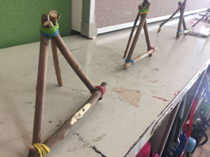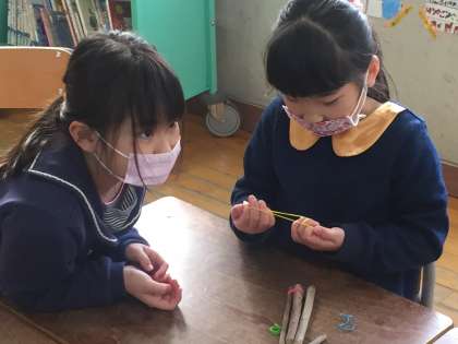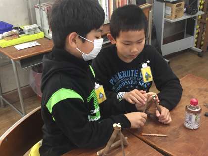 昨年の秋に校内の木々の一部を伐採してできた枝を使って、1年生から3年生が写真立てを作りました。木は切った後で、いろいろなものに生まれ変わり、自分たちの生活に役立てることができます。高学年も同じように作品を作ります。そして、トンボ池の橋を新しいものに作り替えます。