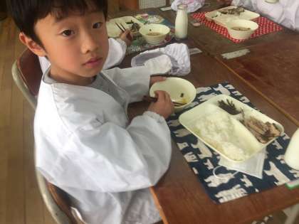 今日の給食は、さんまのみぞれかけ、五目汁、茎わかめのつくだ煮でした。学級休業が明けた1年1組、ずっと元気な2組。みんな笑顔で給食を食べていました。