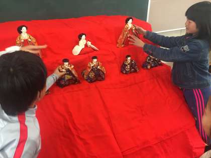 子どもたちとひな人形の飾りつけを行いました。ひな人形は、季節の行事であるとともに日本の伝統を学ぶ機会でもあります。男雛、女雛の位置、三人官女、五人囃子に右大臣、左大臣の並べ方や右近の橘、左近の桜も覚えることができます。