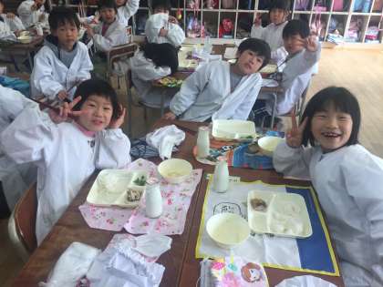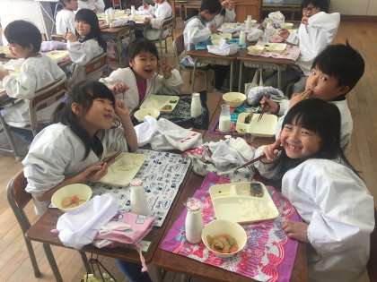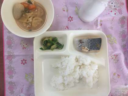 今日の給食は、さばのおろしじょうゆかけ、一口がんもとさといものみそ煮、はくさいのごまあえでした。さばが苦手という子もなく、みんなしっかりと食べていました。小さな骨もじょうずに取っていました。