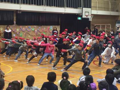 4年生は6年生へのエールを、元気いっぱいな歌とダンスで表現しました。