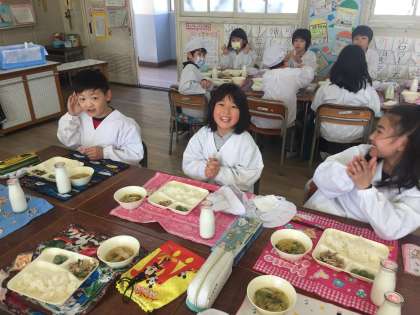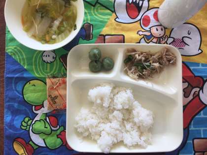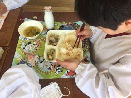 今日の給食は、豚肉と野菜のいためもの、すまし汁、きな粉よもぎだんごでした。きな粉が好きな子は、ごはんにもいっぱいふりかけて食べていました。