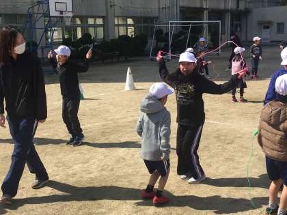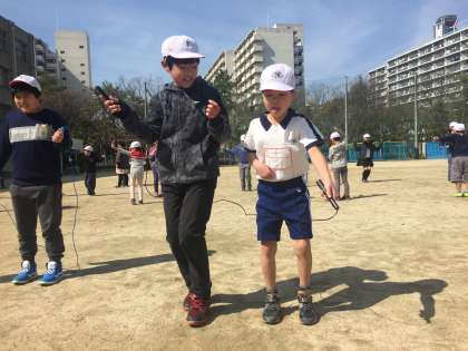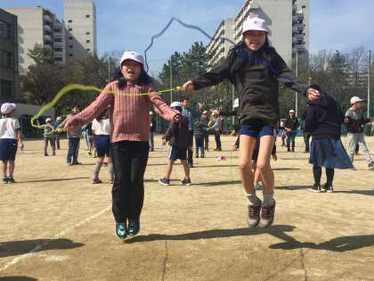 20分休みに教室を空っぽにして、全校で外に出て運動をしています。今日は、兄弟学年でいっしょに縄跳びをしました。体を動かすだけでなく、異学年の交流の機会を増やしていき、仲間作りにも結び付けていきたいと考えています。