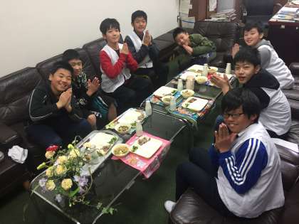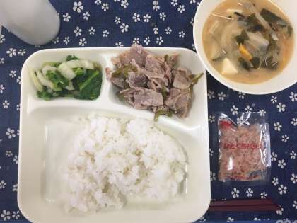 いよいよ6年生と会食するのも最終日となりました。そして、6年生が小学校で食べる最後の給食となりました。献立は、豚肉の梅風味焼き、みそ汁、菜の花のおひたしでした。この学年は食欲が旺盛で、ずっと完食でした。