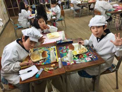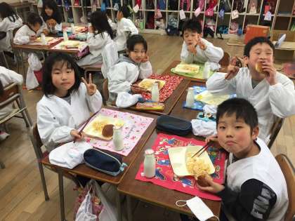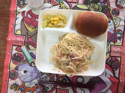 今日の給食は、さけのクリームスパゲッティ、キャベツとコーンのサラダでした。今年度の給食も、あさってが最終となります。