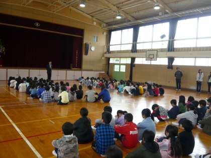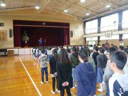 児童たちは少し緊張した顔で始業式に臨みました。はじめから静かな雰囲気で、しっかりと話を聞いていました。校歌も元気よく歌うことができました。