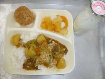 今日の給食は入学お祝い給食で、子どもたちが大好きな「カツカレーライス」「フルーツ白玉」と牛乳です。おいしそうに食べていました。