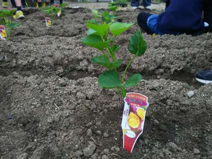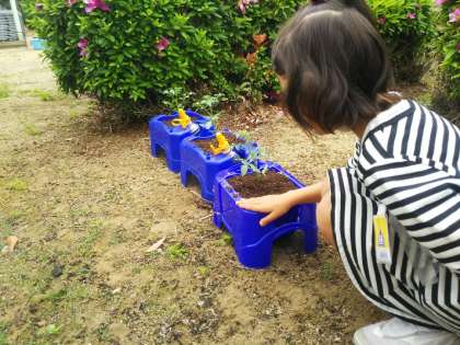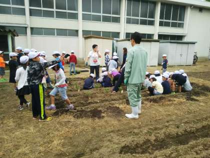 2年生が生活科の学習で、プランターにプチトマトを、学習園にさつまいもと枝豆を植えました。「大きくな〜れ!」と優しく苗を持ち土をかぶせていました。水やりや雑草抜きなど、大切に育てていきましょう。