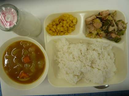 今日の給食は「さけのチャンチャン焼き」「とうもろこしごはん」「スープカレー」です。トウモロコシはご飯に添えて食べます。バターの風味がよく、ごはんによく合っていました。