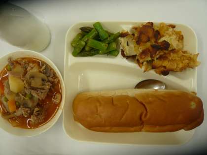 5月7日(月)、今日の給食は「ケチャップ煮」「グリーンアスパラガスのサラダ」「リンゴのクラフティ」とおさつパン、牛乳でした。おさつパンはとても柔らかくて食べやすかったです。