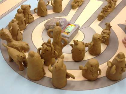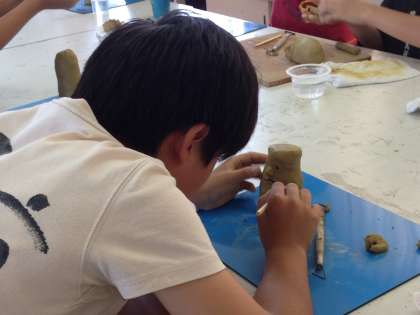 子どもたちは、埴輪づくりをはじめると、表情は真剣そのものでした。出来栄え次第では、近つ博物館の館内に展示してもらえるということもあって、どの作品も力作ぞろいでした。みんなの作品を、前方後円墳のまわりに並べて鑑賞しました。いにしえの人びとも一つひとつ心をこめて作ったことでしょう。