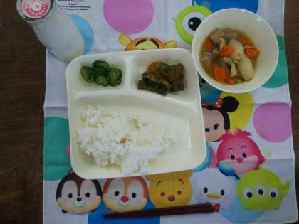 今日は、ちくわのいそべあげ、鶏肉と里芋の煮物、あっさりきゅうり、ごはん、牛乳でした。いそべあげは海苔の香りがとてもよく、とてもおいしかったです。