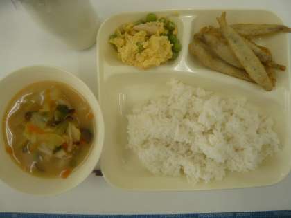 今日の給食は「みそ汁」「きびなご天ぷら」「エンドウの卵とじ」とごはん、牛乳です。「エンドウの卵とじ」は卵除去の個別対応です。