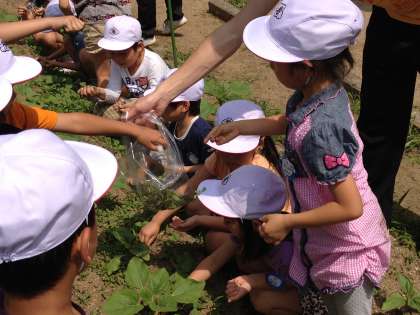 1年生は学習園では「ひまわり」を育てています。しばらくすると、まわりにはたくさんの雑草が生えてきます。除草するのも大切な勉強ですから、ていねいにお世話をしています。