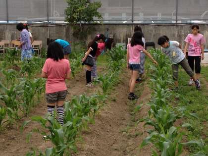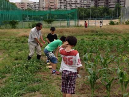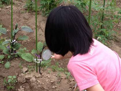 5年生は、咲洲高校の岡田先生から米作りを教えていただいています。今日は、そのご縁で、咲洲高校の畑を見学させていただきました。茄子やトウモロコシなど様々な作物が植えられていました。大きく育っている様子に、みんな驚いていました。
