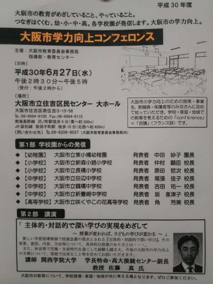 6月27日(水)住吉区民センターにて、大阪市学力向上コンフェロンスが開催されます。大阪市の今の教育の方向性が示され、教育について、学力向上について考える会議です。お時間ありましたら、ぜひご参加ください。