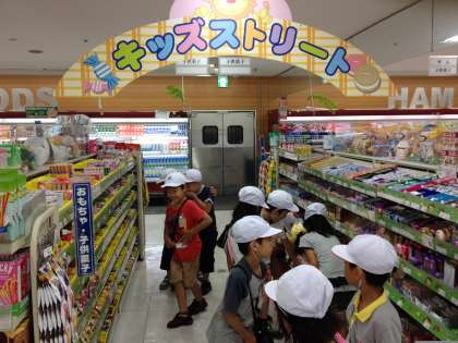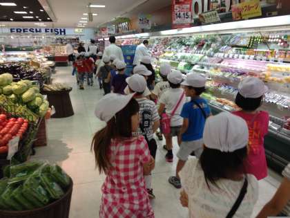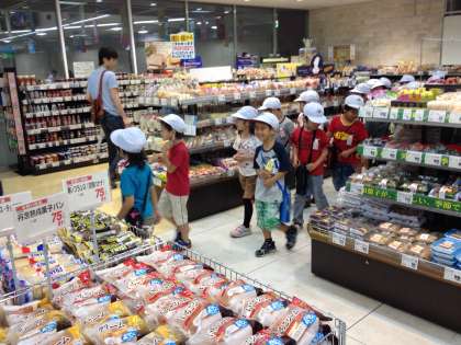 2年生は南港ショッピングセンターに行きました。いつもは、お家の人と一緒に買い物に行っている場所ですが、社会見学となると一味ちがいます。しかも、開店前の店内は他のお客さんはおらず、お店の人が忙しそうに開店準備をしていました。