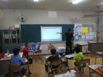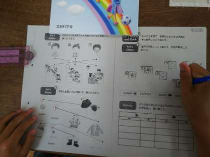今日は3,4年生がパウエル先生と英語の学習をしました。4年生は天気について、先生の発音を聞いて答えていました。