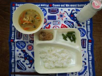 給食は、鶏肉のしょうゆバター焼き、みそ汁、三度豆のからしじょうゆあえ、ごはん、牛乳でした。みそ汁は具だくさんでおいしかったです。給食調理員さん、Many thanks!