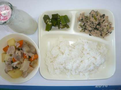 今日の給食は、「豚肉とじゃがいもの煮物」「オクラの梅風味」「ツナっ葉いため」とご飯、牛乳です。オクラはこの時期らしい野菜ですね。