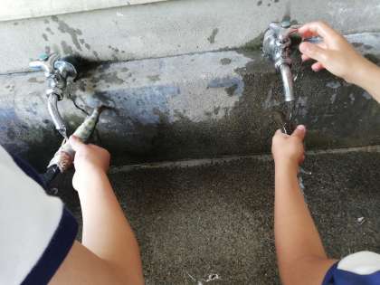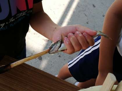 魚を捕まえたら、竹の串に刺して洗います。なかなか串に刺すのは難しかったです。