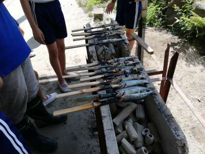 魚を炭火で焼いて食べます。想像以上においしく、みんな満足でした。